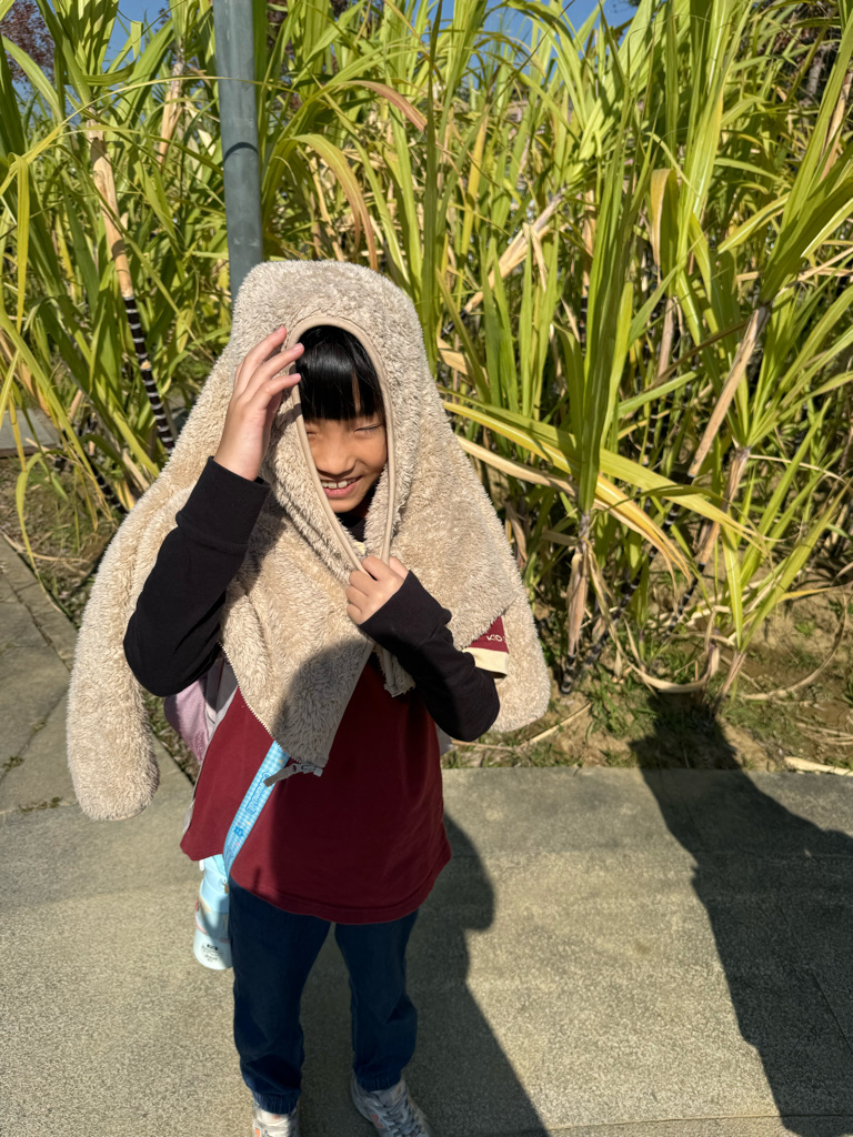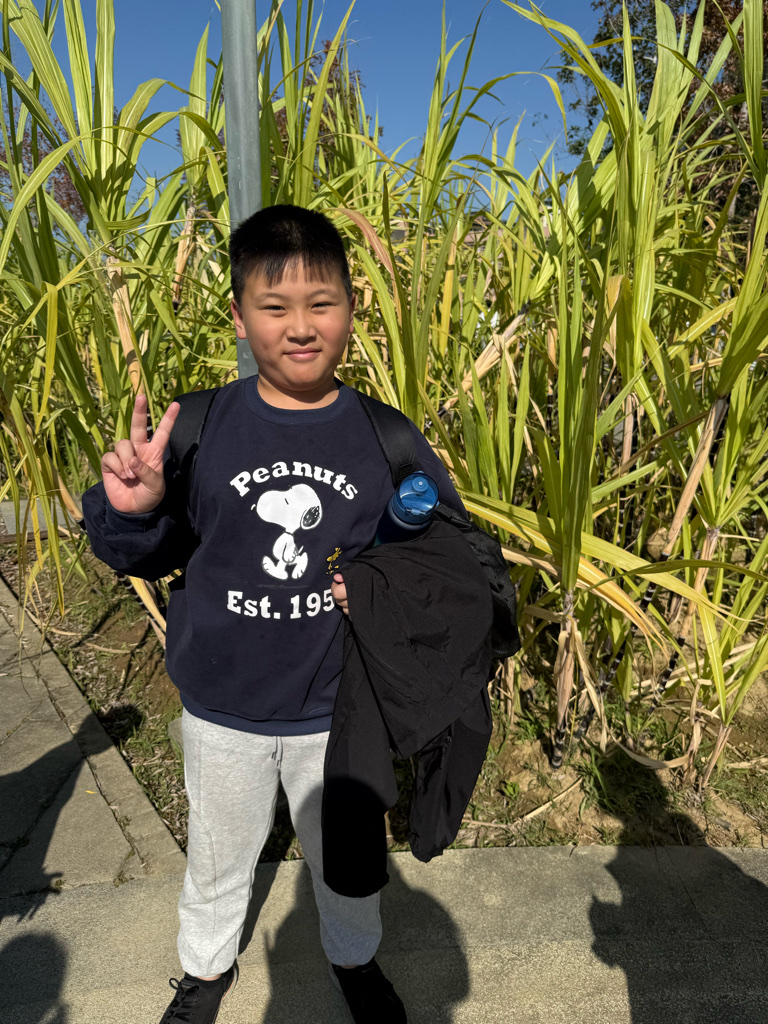 小孩說想跟甘蔗拍照📷但太陽很大睜不開眼睛